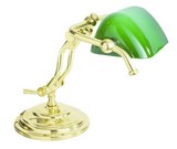 Lampada ministeriale in ottone lucido con paralume in vetro verde.Misure 16per25 altezza totale 35cm. Paralume 22per14. base 18per18 cm.
