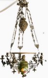 Lampadario ad olio con porta candele e sali e scendi in bronzo e ceramica. non ha impianto luce. Dimensioni h 133 cm x larghezza 60 cm